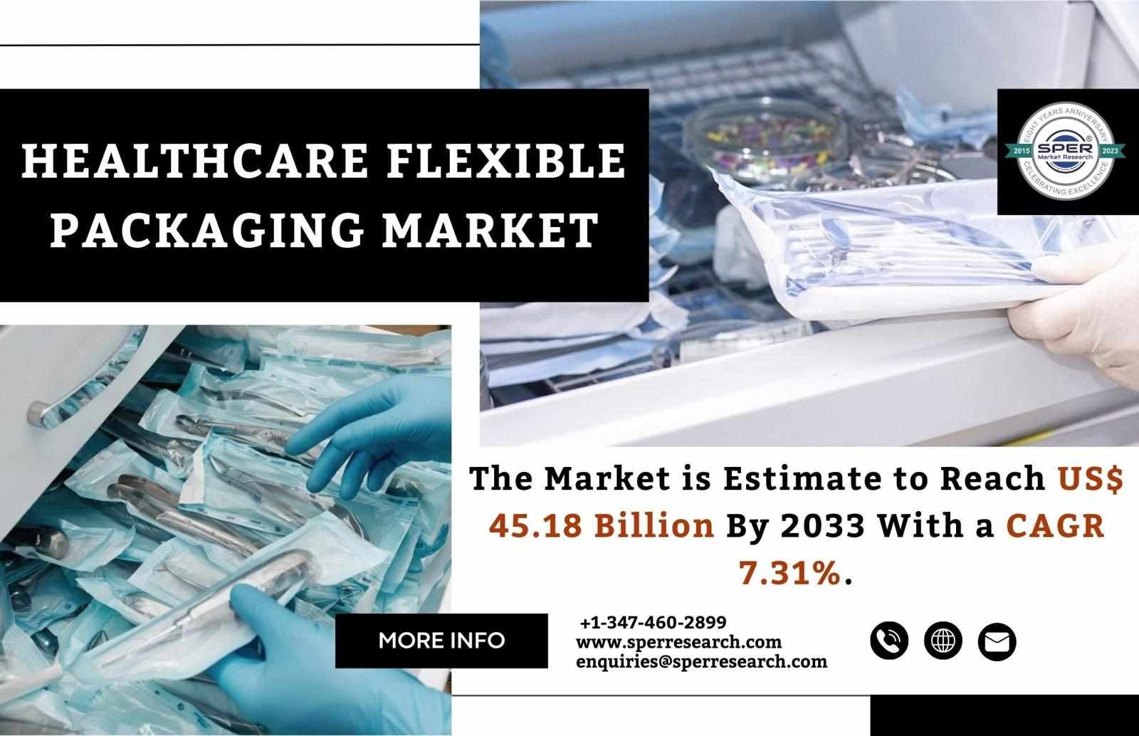 According to SPER market research, ‘Healthcare Flexible Packaging Market Size – By Materials, By Product, By Application, By Packaging Type- Regional Outlook, Competitive Strategies and Segment Forecast to 2033’ state that the Healthcare Flexible Packaging Market is predicted to reach USD 45.18 billion by 2033 with a CAGR of 7.31%.